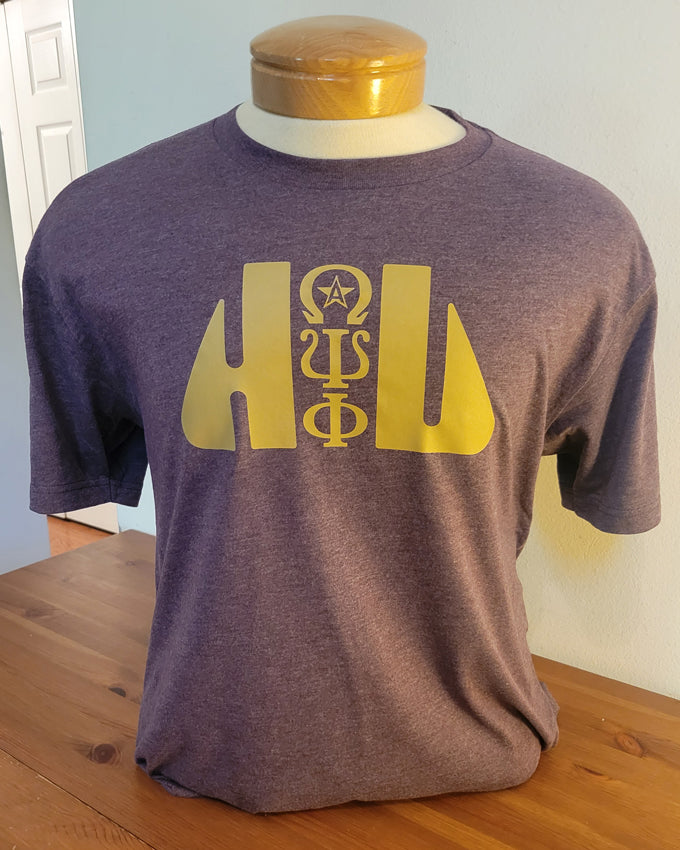 The shirt is a soft vintage heather purple 4.2 oz. premium tri-blend t-shirt. The HU graphic is a true Omega gold that complements the Vintage Purple color of the tee.